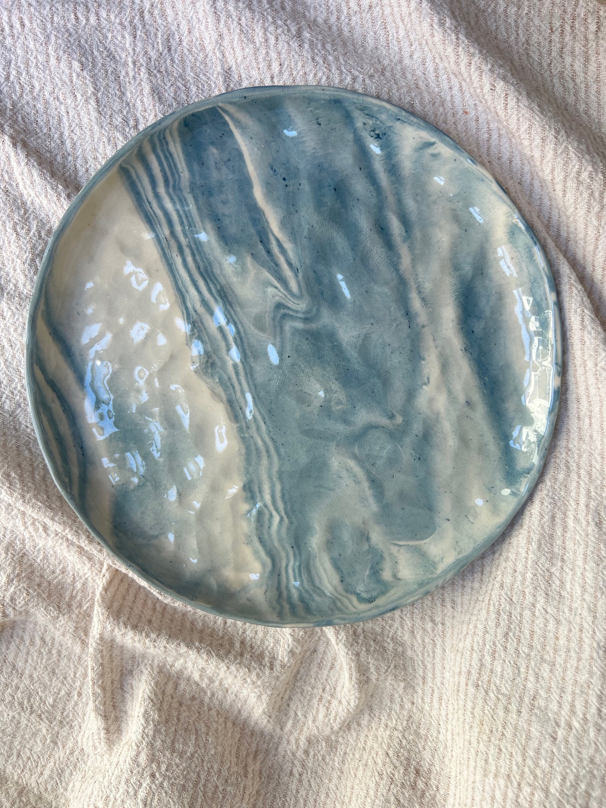 All plates are made with layered hand dyed / neutral clay dressed in glossy clear glaze & raw bottoms. Utilizing the traditional Japanese technique of Nerikomi each plate is unique. See images for all the color variations.